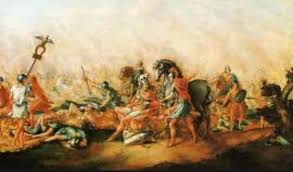 (...) Frattanto, presagio bellissimo, otto aquile attrassero l'attenzione del comandante: le vide volare verso la foresta e poi entrarvi. Grida ai suoi di andare avanti, di seguire gli uccelli di Roma, divinità protettrici delle legioni! I fanti schierati e i cavalieri lanciati all'attacco investono le spalle e i fianchi nemici che fuggono. Tra questi, ben visibile, Arminio, coi gesti e con le grida mostrando la ferita riuscì a passare imbrattandosi il viso del suo sangue per non essere riconosciuto.